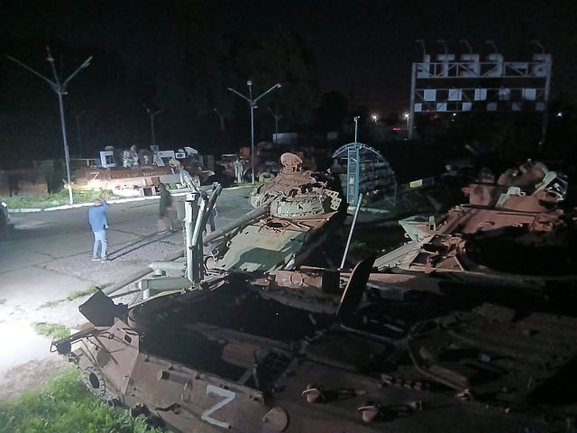 Det enda ljuset kom från bilens strålkastare. Snart uppenbarade sig ett pansarskyttefordon i ljuskäglan. Totalförstörd. Och så en till, och så ännu en. Guiden hade tagit oss till en kyrkogård för ryskt militärmateriel. Det låg kringstrött som stupade urtidsdjur, täckte av blodliknande rost.