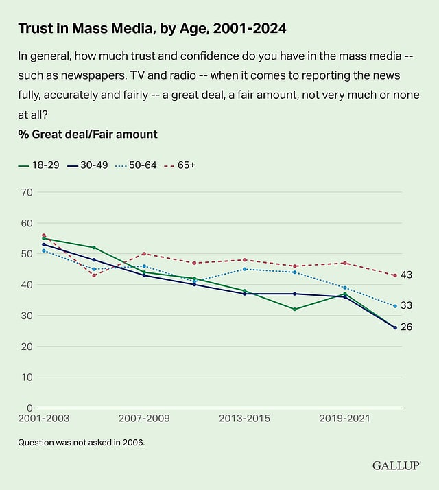 Politiska sympatier påverkar också förtroendet. Bland demokraterna uttrycker 54 procent ett visst förtroende för media, jämfört med endast 12 procent bland republikaner. Yngre demokrater är dessutom mer skeptiska än äldre; bara 31 procent av demokrater i åldern 18-29 har förtroende för massmedia, medan 74 procent av de som är 65 år eller äldre har det.