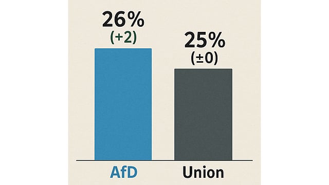I den senaste opinionsmätningen från Forsa går nationalistiska Alternativ för Tyskland (AfD) om regeringspartiet CDU/CSU (Union) och blir största parti. AfD får nu 26 procent, en ökning med två procentenheter sedan förra mätningen.
