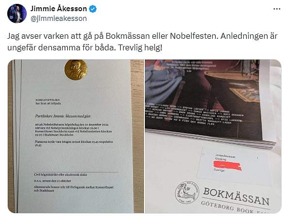 Sverigedemokraternas partiledare Jimmie Åkesson har för andra året i rad fått en inbjudan till Nobelfesten, efter att tidigare ha varit utestängd på grund av Nobelstiftelsens värdegrund. Trots det väljer Åkesson återigen att tacka nej, precis som han gjorde förra året. I ett inlägg på plattformen X förklarar Åkesson att han inte kommer att delta i vare sig Nobelfesten eller Bokmässan.
