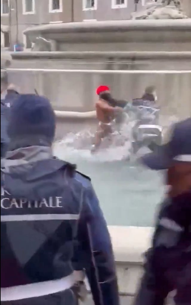 I en video som publicerades den 20 oktober visas det hur en naken migrant skändar en romersk fontän genom att bada naken i den. Detta bryter mot den italienska lagen om offentlig anständighet och lagstiftning som skyddar kulturarv. När poliserna skulle gripa gärningsmannen så gjorde han våldsamt motstånd.