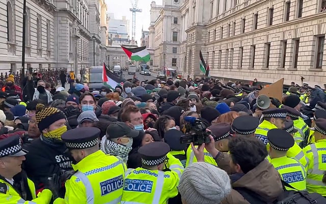 Den 28 november samlades återigen ännu en hotfull skara palestinaaktivister. Den här gången demonstrerade de utanför utrikesministeriet i London. En stor skara poliser var på plats, men anmärkningsvärt nog så var responsen från polisen tydligt svagare än vad den var mot protesterna som uppstod efter att en migrant knivhuggit flera barn – något som skedde under delar av juli och augusti i år.
