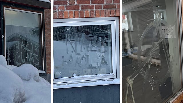 På väggarna hade okända personer klottrat bland annat "Fuck off Nazi Cunts", "Nazist håla" samt målat en anarkistsymbol.