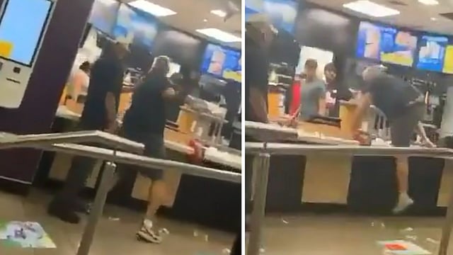 Ett storbråk på en McDonalds i en mångkulturell del av London har fångats på film. Den chockerande filmen visar hur en kund kastar ett föremål mot en anställd varpå han hoppar över disken och börjar måtta slag mot honom. Två andra anställda försökte hålla tillbaka den stökiga kunden – men han vägrade ge sig, och till slut tacklade han sin måltavla till marken.