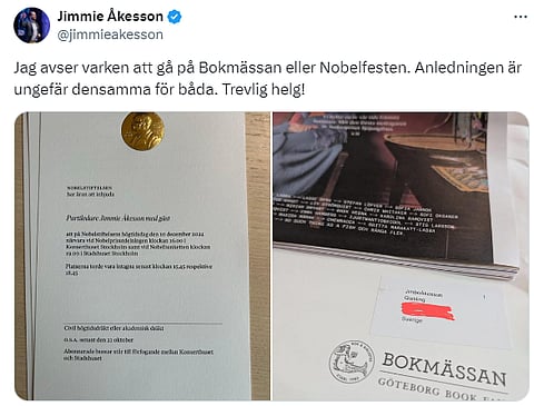 Sverigedemokraternas partiledare Jimmie Åkesson har för andra året i rad fått en inbjudan till Nobelfesten, efter att tidigare ha varit utestängd på grund av Nobelstiftelsens värdegrund. Trots det väljer Åkesson återigen att tacka nej, precis som han gjorde förra året. I ett inlägg på plattformen X förklarar Åkesson att han inte kommer att delta i vare sig Nobelfesten eller Bokmässan.