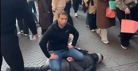 Dramatiska videoklipp visar hur mannen brottar ner gärningspersonen och håller honom nere i väntan på polisen.