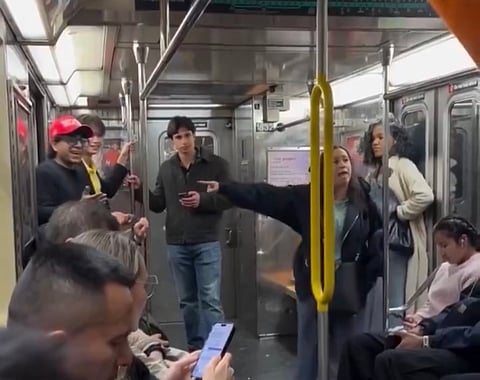 Kvinnan på New York Citys tunnelbana börjar verbalt attackera mannen med MAGA-kepsen oprovocerat.
