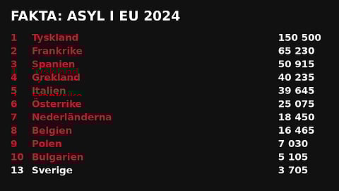 Till jämförelse tog Tyskland emot flest i EU, med 150 500 beviljade asylansökningar. Totalt ökade antalet godkända asylansökningar i EU med 6,9 procent till 437 900 under 2024 – den tredje högsta siffran på 15 år.